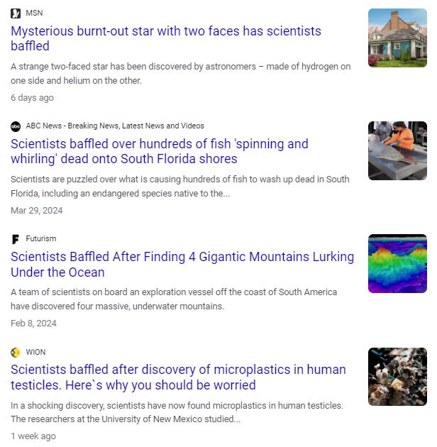 As a certified word nerd, it’s interesting to me that scientists are always baffled. They’re never perplexed (curious), confounded (annoyed), bewildered (disoriented), or mystified (fascinated). Baffled implies a sense of confusion and frustration over something that is inexplicable, unsolvable, or counterintuitive. “Wife baffled by husband’s inability to put dirty socks into the hamper.” “Cat owner baffled by Paw Revere’s obsession with cardboard boxes.” The word itself—as opposed to its closest cousins—all but suggests defeat. It is what it is. C’est la vie.