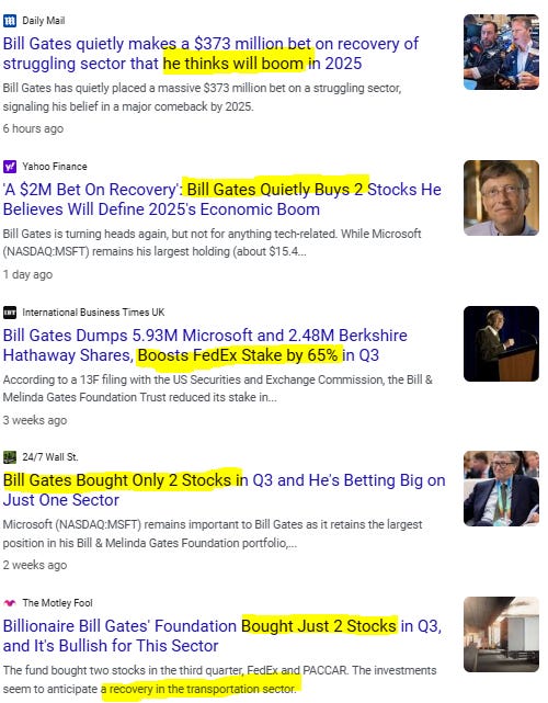 Good try, but Gates is not a bad investor. Sociopaths are like that. Being shallow top-down types, they see patterns decently better than most as the rest of us tend to see too many details of humanity and our pattern recognition is confused by our assignment of basic human values. Sociopaths don't recognize basic human values. They only see how money and power flow and chase these instead. Yes, the economy has been fine despite the fear porn of the last 30mos. The orders for new Class 8 trucks has exceeded the capacity to manufacture them. Demand is high. Despite the media telling all that AI is the only investment worth noting, we continue to recover from COVID lockdowns and are ramping up reshoring of manufacturing to avoid the issues with supply chain disruptions. Gates sees this and invests accordingly. The economy is much better and has been much better all along than the media publishes. Good news does not sell advertising the way fear motivates viewership.