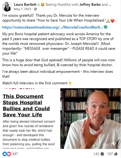“I receive many testimonies but one of the most impactful was an elderly woman with Covid who used the I Do Not Consent Form and went home from the hospital after six days,” Laura recalls. “She didn’t get a single dose of Remdesivir, a ventilator, or the Covid vaccine. However, the physician ordered budesonide according to her wishes outlined on the Form. So not only did she NOT get what she didn’t want, she got exactly what she needed to get well.”