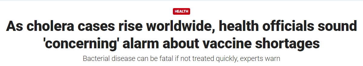 According to Dr. Renuga Vivekanandan, assistant dean and professor at the Creighton University School of Medicine in Omaha, Nebraska and a skilled panic-inducer, dehydration is the biggest concern with cholera (on account of the diarrhea; sorry), and rehydration is the most important treatment. Obviously we need to throw Ukraine-level funding at this thing to make sure we can inject every arm in every potentially at-risk locale on earth if we’re going to try to nip this literal shitstorm in the butt bud.