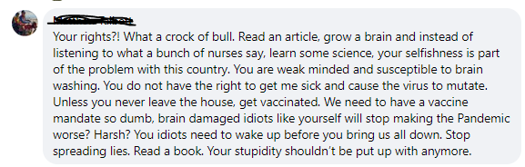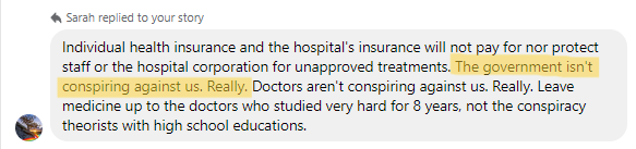 Every other week or so, Sarah would comment on my stories, making it abundantly clear that she was all in on the jabs, the masks, the mandates, and the rest of the madness. I tried my best to ignore her—