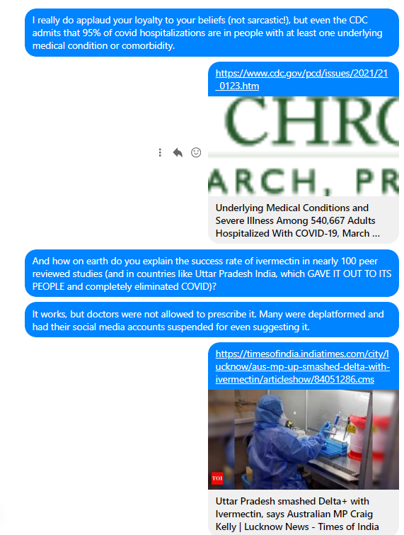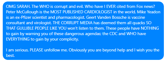 As a study in propaganda, Sarah was fascinating to me. Weeks would pass blissfully without a peep, and then suddenly she’d slide into my DMs just to discredit this post or that story with a flip “that guy’s not even a virologist.” [If you see Sarah drowning, please do not throw her a life preserver unless you’re a licensed, board-certified lifeguard.]
