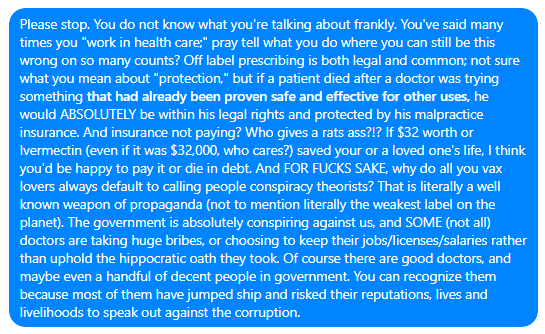 I had all but stopped responding to Senseless Subjugated Sarah, but then she had the nerve to attack ivermectin.