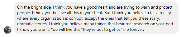 I’m actually jealous of Sarah. I’d love to live her “they’re out to help us” life forever—or even for a day. Fine, fifteen minutes. I wish every organization being corrupt was a false reality, and that I didn’t have to spend my days trying to warn and protect people about things, especially people who don’t heed or appreciate my warnings. I miss pre-Covid Jenna. She was really fun. But she’s got a job to do—namely, wake people up—and she’s going to do it or die trying.