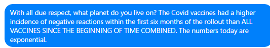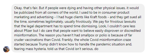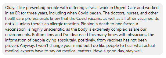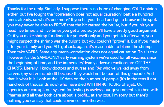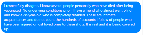 This was in June of 2022, and the serum allergy theory was a new one to me. As was calling post-vaccine deaths “gossip.” This was my reply:
