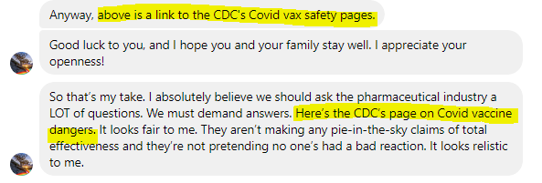 “We should absolutely ask a LOT of questions and demand answers! Here’s a handy CDC link! See, they’re not pretending no one’s had a bad reaction! It looks relistic [sic] to me!”