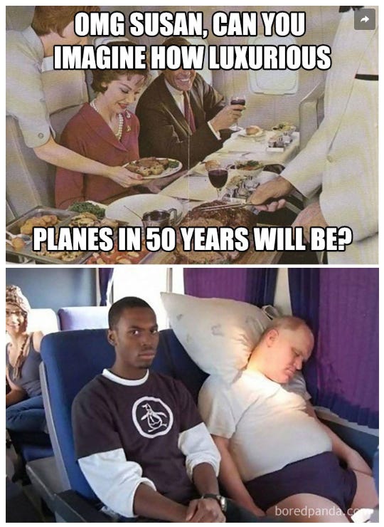 This is one of those times where I so wished we could post pictures… specifically, 1959,my two older sisters and me in matching plaid suits, pleated skirts with double breasted jackets flying from Idlewild ( JFK) to Paris… my oldest sister wore white gloves, I , the youngest , curtsied upon greeting people…. My family lived in Europe, it’s how we rolled. Yes, that sounds a bit much but a course correction seems in order… I don’t think pajama bottoms, fluffy slippers and gym attire is appropriate travel attire. And as a former “ Stewardess” from the 70s I can confirm that all around it’s only been a downhill slide…. One of the most notable recent changes is that the COVID mask caper turned the crew ( and I actually mean the flight attendants) into authoritarian whack jobs… taking to the Microphone every twenty minutes reminding us we’d be jettisoned out the back if we didn’t chew our pretzels with our face diapers on…. I was on an American Airlines flight where the “senior” flight attendant informed me my mask was not on properly…. As a former “stew” I am always polite to these people. My polite response was met with “ I can arrange for you never to fly on American again”….AA Customer Service wrote me a “we’re so sorry” letter… but think about COVID and air travel and how utterly ridiculous and unnecessary it all was!